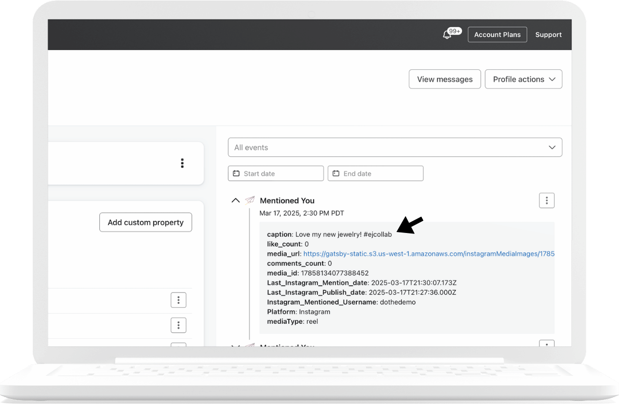 See social engagement directly inside Klaviyo. Gatsby automatically adds events like “Mentioned You” from Instagram and TikTok to each customer profile. Unlock smarter segmentation, automations, and attribution.